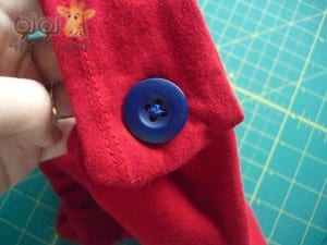 نأخذ كل طرف ونحيكه (أو نخيطه) على كتف التيشيرت أو حَمّالة التيشيرت، ثم نضع على الغرزة زرارًا بلون مناسب ليُخفي شكل الخياطة ويُعطي مظهرًا جميلًا.