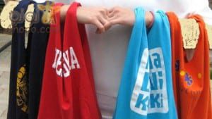 ممكن استخدام التيشيرت أيضًا في عمل شنط للكبار للتسوّق، وذلك عن طريق تقفيلها من الأسفل ولبس الحمالات كما في الصورة.