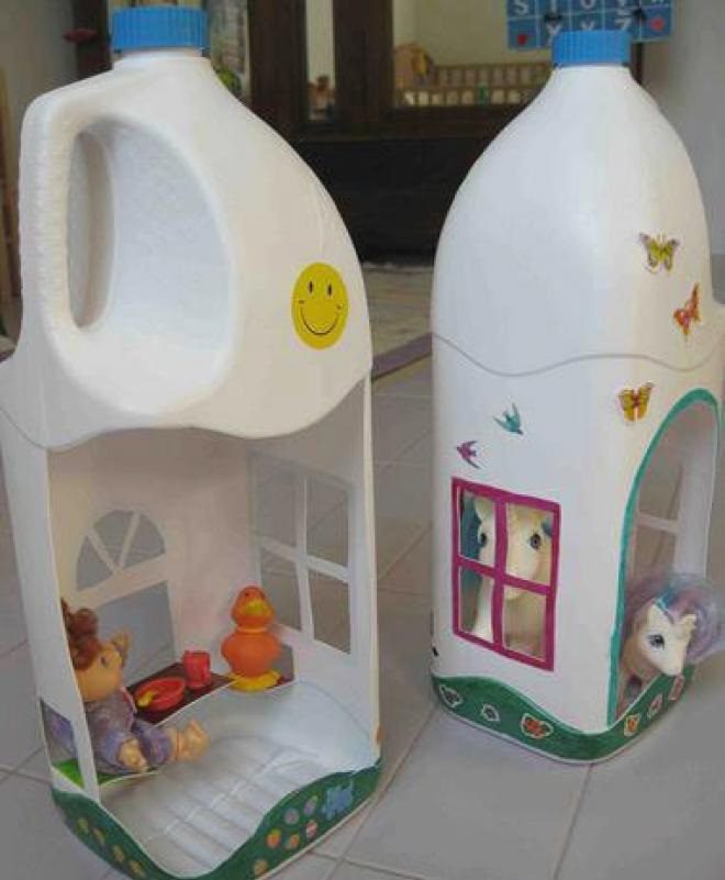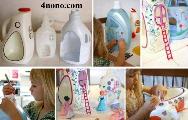 ثالثًا: الزجاجات البلاستيكية لعبة على شكل بيت يفرح بها طفلك، ما عليكِ سوى أن تقطعي العبوة كما هو موضح وتضيفي الألعاب والقطع الصغيرة لتزيين البيت. اصنعيها ببساطة لعبة جميلة لطفلك بأبسط الأدوات.