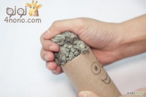 نحشو الرول الكرتون من أعلى بعجينة الجرائد، ونترك مسافة مثل القُبّة لعمل الرأس، وقُبّة صغيرة من أسفل لغرس الأرجل بها، ثم نتركه يجف في الشمس.