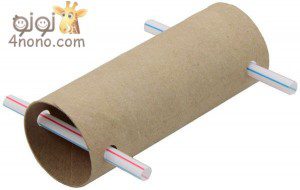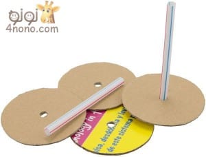 يتم عمل أربع دوائر متساوية من الكرتون، وعمل ثقب في كل واحدة منها لإدخال عصا العصير بها.