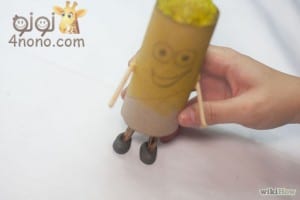 يتم ثَقب ثقبين على جانبي الرول لعمل اليدين، ثم نضع عصوين خشبيتين لليدين ونلصقهما بالشمع.