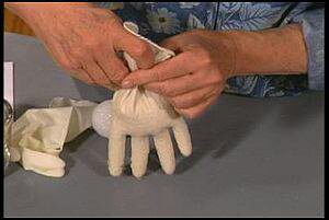1- فى البدايه نقوم بتعبئه القفاز المطاطى بالرمال وعندما يصل الى المنتصف نقف على تعبئه الرمال ونعبئ الرمال فى اربعة صوابع فقط من القفاز كام فى الصوره.