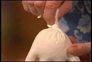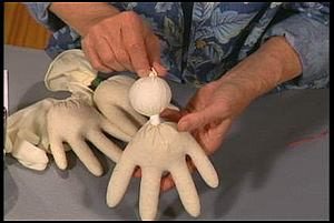 2- نقوم بربط الاصبع الخامس الذى لا يوجد به رمال حلو معصم القفاز ونقوم بعمل هذا حتى تقوم الاصابع بتشكيل ايدى وارجل الدميه كما فى الصوره.