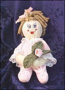 6- ثم بعد ذلك نعمل على اضافه خيوط الصوف فى اعلي الدميه فوق الجزء الموجود فيه الكره الاسفنجيه حتى يكون هذا الصوف هو شعر الدميه .. ولا مانع من اضافه ورده فى يد الدميه لتعطيها شكل اروع كما هو مبين فى الصوره السابقه.
