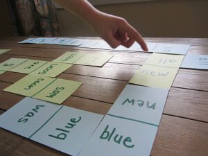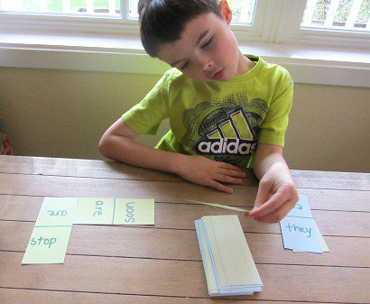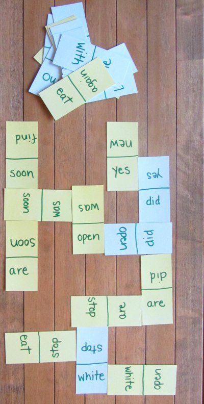 * قسمي الورق عليكي انتي و طفلك و دعي طفلك يضع الكلمات المتشابة معا مثل الدومينو فيتعلم الطفل الكلمات بطريقة بسيطة.