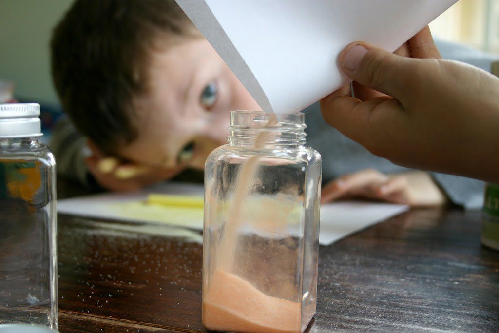 و من ثم يستخدم القمع او بطرف الورقة في و ضع كل طبقة من الرمل المصنف من الملح و الطباشير طبقة بعد طبقه.