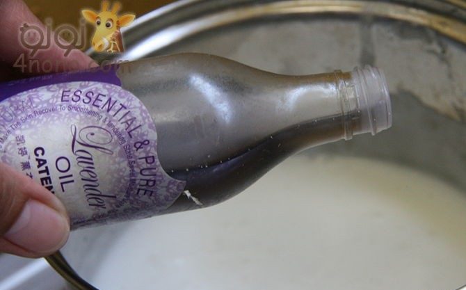 يضاف قليلا من الزيت العطرى المفضل مثل النعناع او اللافندر او البرتقال او اى نوع تفضلوه ويقلب جيدا ويرفع من على النار.