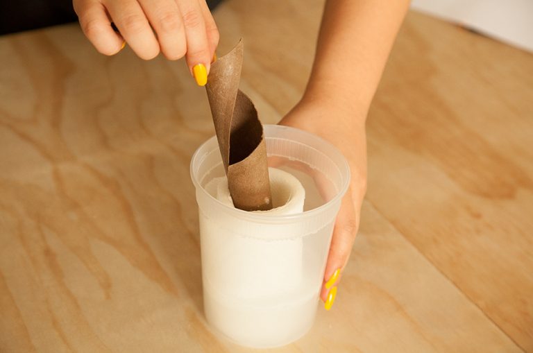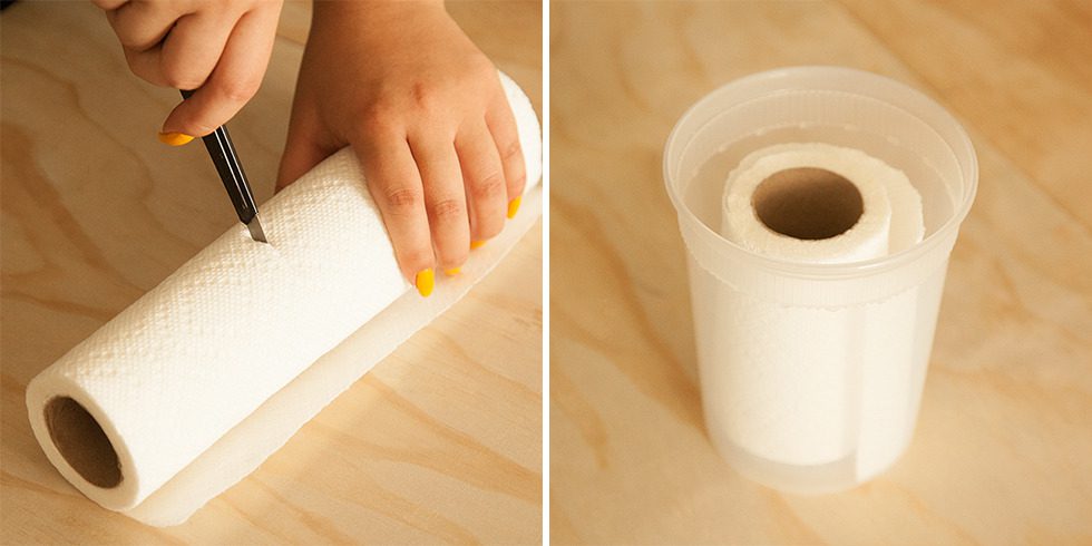 تترك السائل بها 5 دقائق لتمتصه ثم يسكب الباقى ثم يتم ازالة البكرة الورق الكرتون من المناديل.