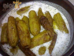 ثم نضيف الكوسة لخليط الزبادى ويترك 5 دقائق ثم يرفع
