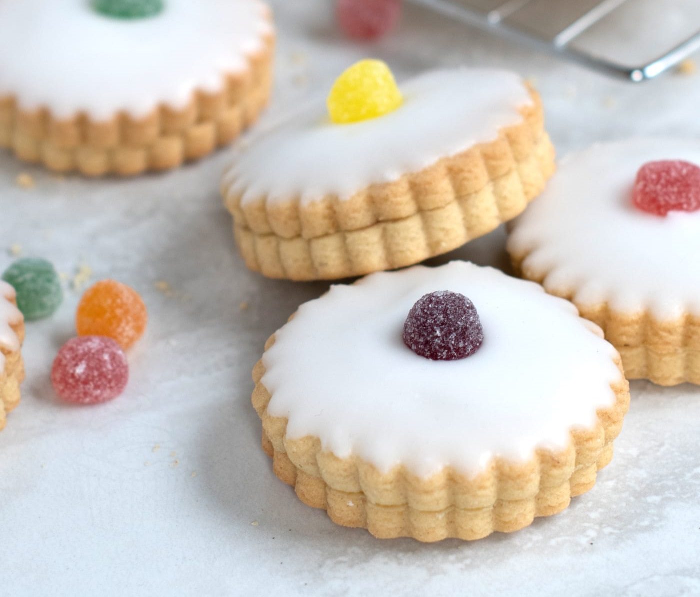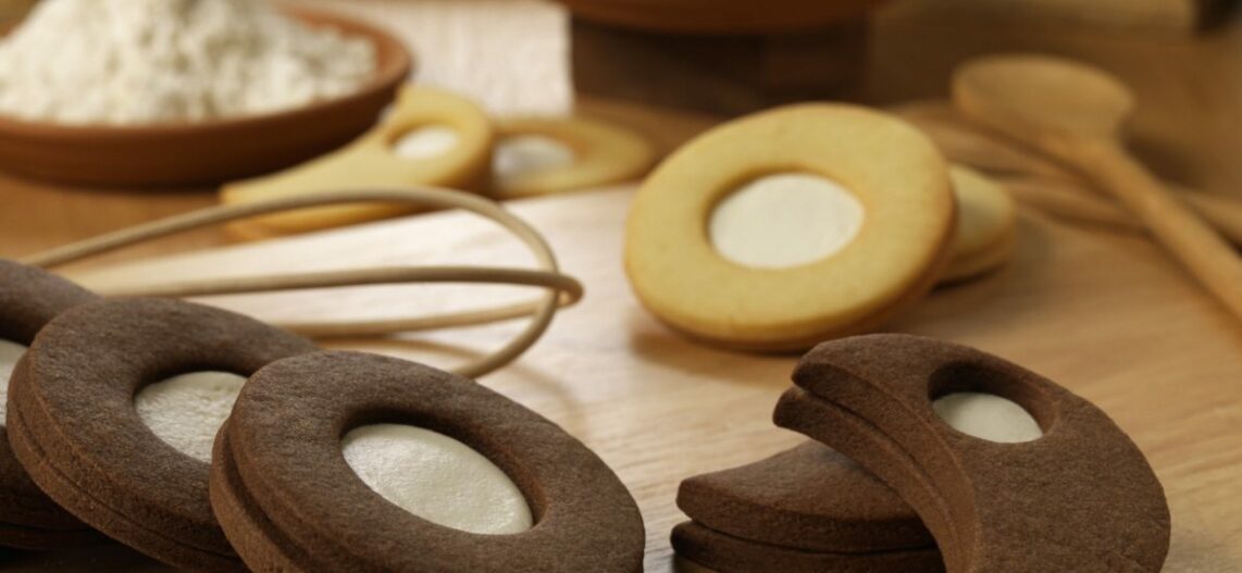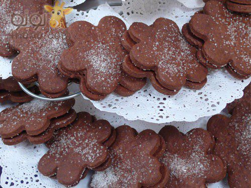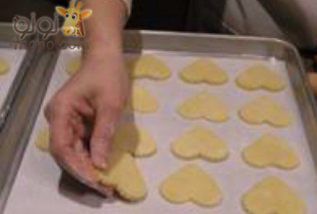 ترص الاشكال بصوانى مبطنة بورق زبدة ونزيل منها بقايا الدقيق بفرشاة وتكرر العملية مع باقى الكمية اللى بالثلاجة