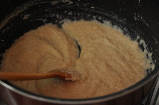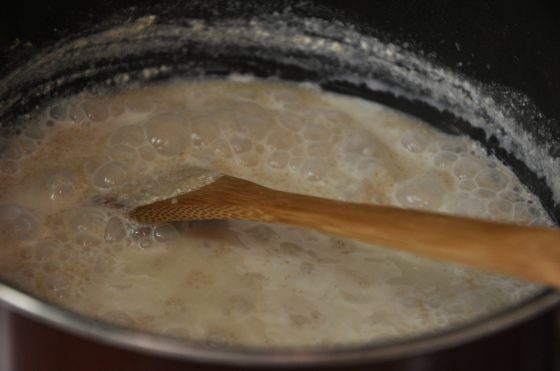 نترك السميد يغلي حتى يثقل الخليط وتقل نسبة الحليب